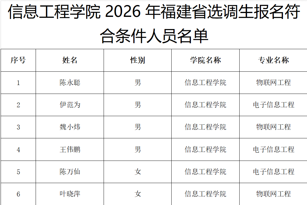 根据 2026 年福建省选调生选拔工作相关要求,经学生自愿报名、学院资格审核等环节,现将我院符合报名条件的人员名单予以公示(名单附后)。公示时间2025年12月8日-2025年12月10日。